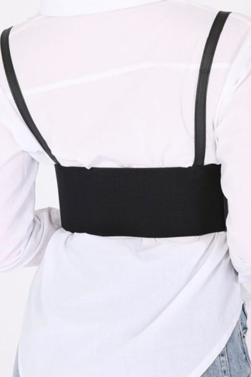 Wide elastic corset belt harness style with shoulder straps.